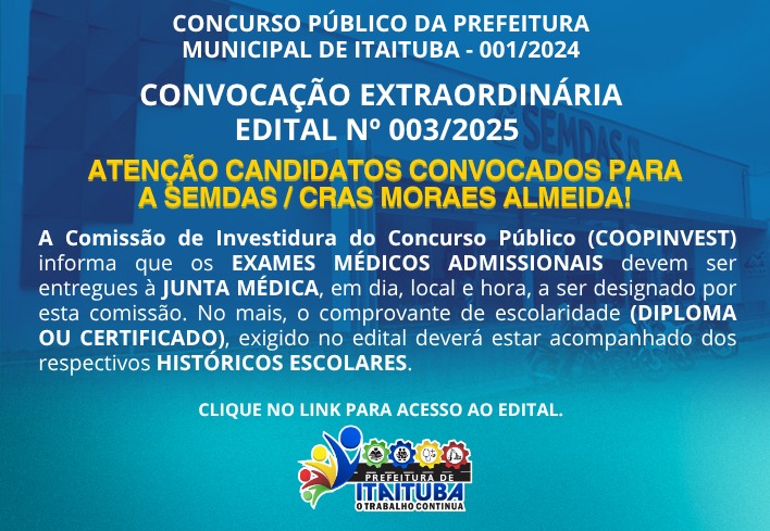 A Prefeitura Municipal de ITAITUBA - PA, pessoa jurídica de direito público interno, neste ato representada pelo Exmo. Sr. Prefeito Municipal NICODEMOS ALVES DE AGUIAR e Sr. DIEGO JOSÉ MOTA FREITAS, Secretário Municipal de Administração, faz saber a todos os interessados a publicação do presente Edital de convocação para posse, correspondente ao resultado de aprovação decorrente do Concurso Público realizado através do Edital n° 001/2024, da Prefeitura Municipal de Itaituba, cujo resultado final foi homologado através do Decreto Municipal nº 096/2025, publicado no Diário Oficial dos Municípios do Estado do Pará no dia 10/06/2025, Edição 3768 e na Home Page www.consulpam.com.br. Portanto, CONVOCA os CANDIDATOS classificados/aprovados, conforme relação por cargo/ordem de classificação constante no ANEXO I, para que no dia e horário discriminados em referido anexo, compareçam à sala da Comissão de Organização e Processo de Investidura do Concurso Público da Prefeitura Municipal de Itaituba - COOPINVEST, localizada no 1º andar do Centro Administrativo Municipal, sito a Rodovia Transamazônica, 1.525, Bairro Floresta, Сер: 68.180- 010, Itaituba-Pará, a fim de habilitar-se ao processo de investidura no cargo público.