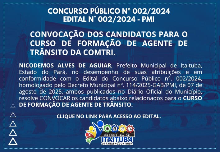 NICODEMOS ALVES DE AGUIAR, Prefeito Municipal de Itaituba, Estado do Pará, no desempenho de suas atribuições e em conformidade com o Edital do Concurso Público nº. 002/2024, homologado pelo Decreto Municipal nº. 114/2025-GAB/PMI, de 07 de agosto de 2025, ambos publicados no Diário Oficial do Município, resolve CONVOCAR os candidatos abaixo relacionados para o CURSO DE FORMAÇÃO DE AGENTE DE TRÂNSITO, conforme estabelecido no capitulo XI, para comparecer no 15º Batalhão de Policia Militar de Itaituba- 15ºBPM, situado na Rodovia Transamazônica, S/N, km 0, Bairro Liberdade, na sala de instrução, para realização do Curso de Formação nos períodos de 17/11/2025 à 15/12/2025, de segunda à sábado, no horário de 08:00 às 11:40hs e 14:00 à 17:40hs (manhã e tarde), de caráter eliminatório para a investidura no cargo, conforme Capitulo XI, item 3, do Edital Nº 002/2024-PMI.