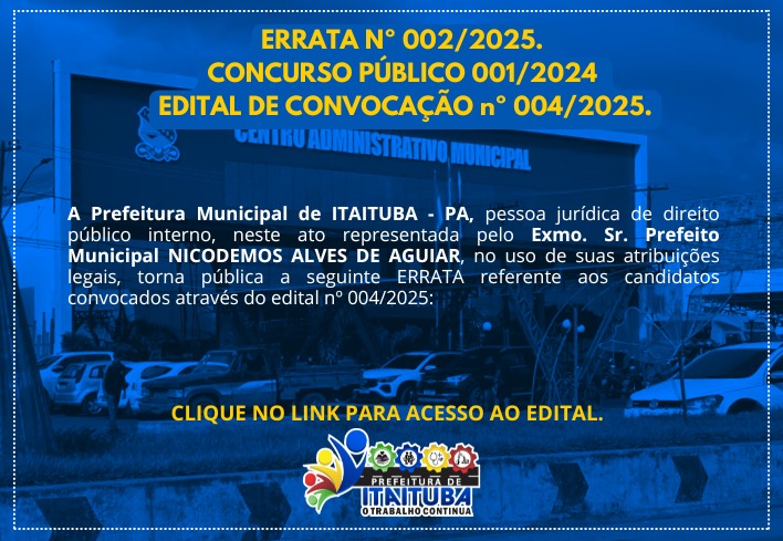 A Prefeitura Municipal de Itaituba - PA, representada pelo Prefeito Nicodemos Alves de Aguiar, informa a publicação da ERRATA Nº 002/2025, referente ao Edital de Convocação nº 004/2025 do Concurso Público 001/2024.