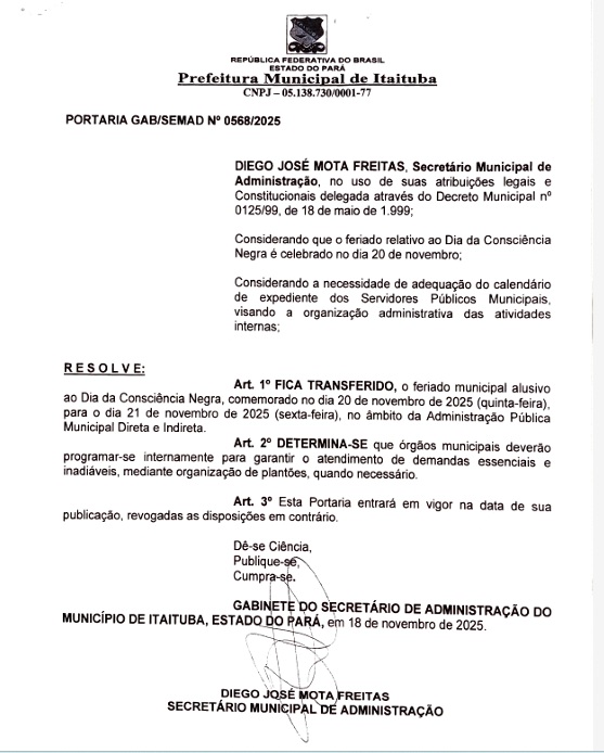 A Portaria GAB/SEMAD nº 0568/2025 Transfere o feriado em âmbito municipal para o dia 21/11 (Sexta-feira).