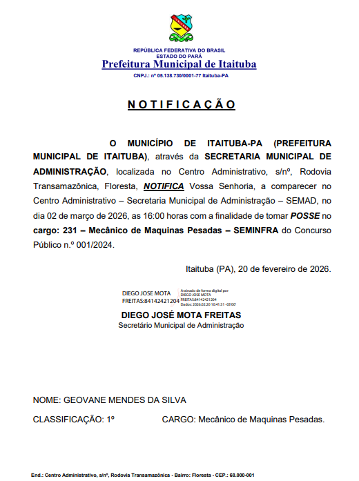 O MUNICÍPIO DE ITAITUBA-PA (PREFEITURA MUNICIPAL DE ITAITUBA), através da SECRETARIA MUNICIPAL DE ADMINISTRAÇÃO, localizada no Centro Administrativo, s/nº, Rodovia Transamazônica, Floresta, NOTIFICA Vossa Senhoria, a comparecer no Centro Administrativo – Secretaria Municipal de Administração – SEMAD, no dia 02 de março de 2026, as 16:00 horas com a finalidade de tomar POSSE no cargo: 231 – Mecânico de Maquinas Pesadas – SEMINFRA do Concurso Público n.º 001/2024.